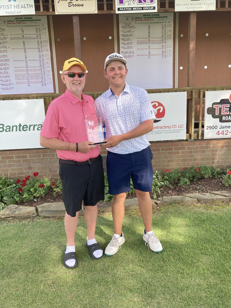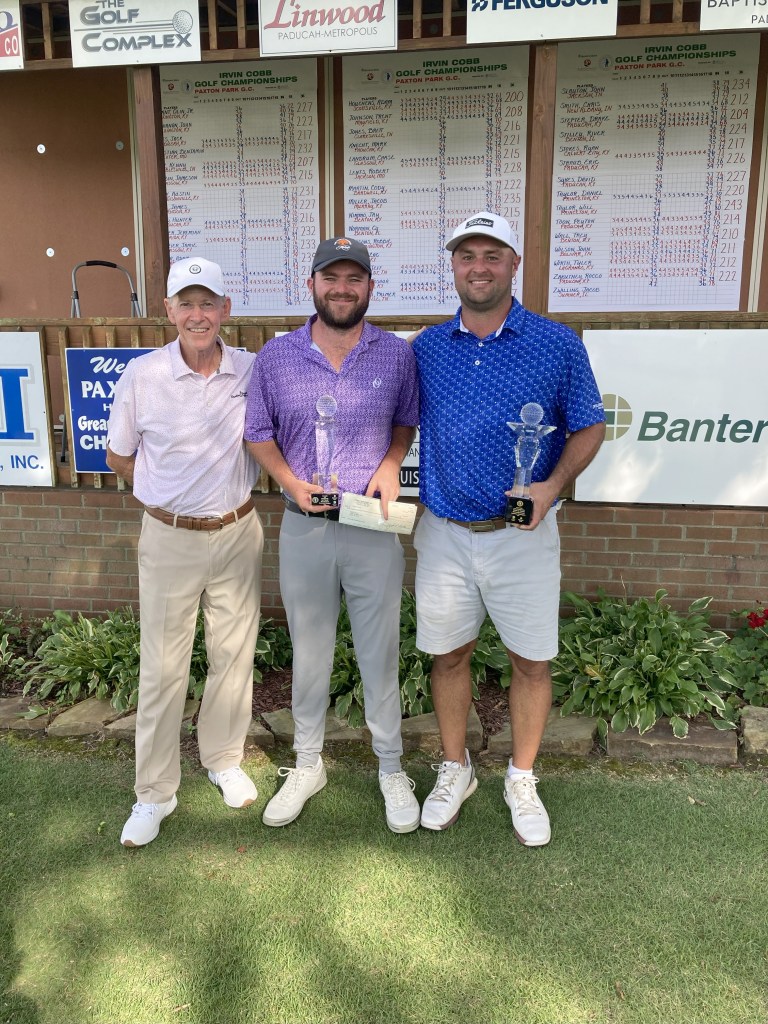 2025 Irvin Cobb Champions:  Top picture–Mayor George Bray presenting Low Junior trophy to Landon Hunt of Paducah.  Bottom Picture–PGA Tournament Director Danny Mullen, Professional Champion Graham McAree of Fishers, IN and Amateur Champion Adam Houchens from Scottsville, KY.